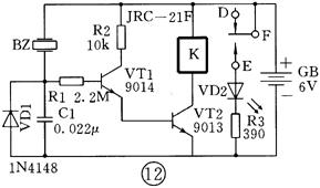 继电器电路 见图9 。继电器K选用JRC—21F等超小型弱功率电磁继电器,线圈电压选6V,消耗功率0.36W。由于继电器线圈工作电流60mA,比玩具电动机工作电流小,比蜂鸣器、发光二极管工作电流大,因此设计电路时各元件参数介于两者之间,图中参数供参考。在图9继电器电路中,F为衔铁,D为常闭触点,E为常开触点。当控制开关S闭合时,继电器吸合,常开触点F-E接通,发光二极管VD1点亮,R2为限流电阻器。图9控制开关S换成干簧管开关、双金属复片开关,就可以进行磁控和热控自动控制了。继电器触点可以根据需要选用常开或常闭触点。由于继电器触点与传感控制电路隔离,选用JRX型继电器,其触点可以接220V交流电,直接驱动交流电用电器。这些简单的自动控制器有什么用途呢?比如,利用荧(日)光灯中启辉器中的双金属复片,改制成可控温度传感器,制作成简易电子恒温箱、酸奶器,甚至炕头孵化鸡蛋的过热、过冷报警器等。